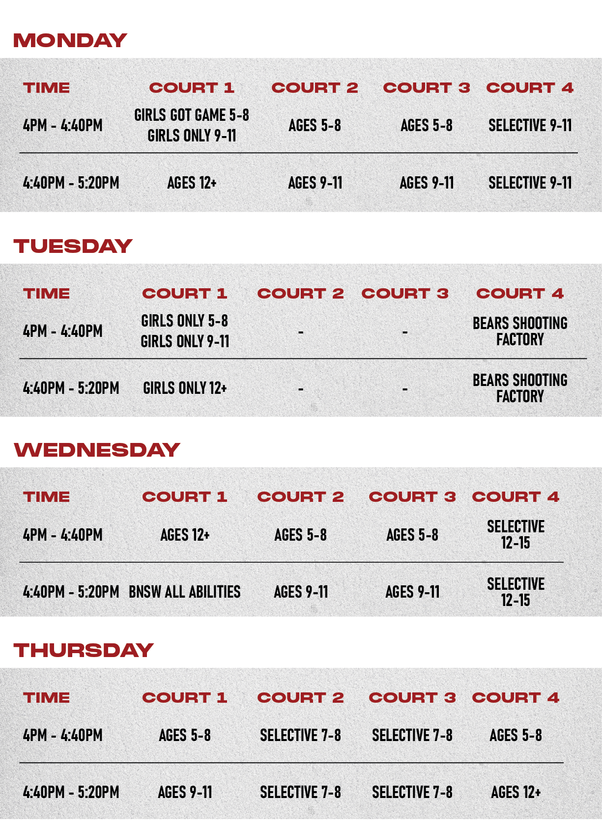 All sessions are held at North Sydney Indoor Sports Centre.